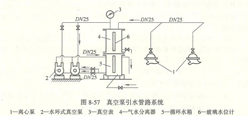 防洪搶險救災開關電源混凝土泵車真空泵水泵的管道布局,如圖所示8-57所顯示。圖上氣水分離器的功效是為了更好地防止泵中的水和殘渣進到真空泵內,危害真空泵水泵的一切正常工作中。針對運輸冷水的污水處理廠電能夠無需氣水分離器。水環式真空泵在運作時,應該有小量的流水不斷循環系統,以維持一定容積的水環立即帶去因為離心葉輪轉動而造成的發熱量,防止真空泵因升溫過高而毀壞,因此,在管道上安置了循環系統儲水箱。可是,真空泵運作時,吸進的水流量不適合太多,不然將危害其容積高效率,降低排量。