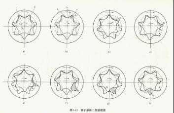 如圖所示l-12a所顯示,該汽油泵由內轉子l,外轉子2及配流盤和檔板等構成。a、b為配流盤的配油對話框。擺線轉子泵內轉子的齒型為擺線(外傳動齒輪),外轉子的齒型為弧形,二種齒線為一對共軛點曲線圖。內轉子齒數為Z1,外轉子齒數為Z2=z1 1,他們與配流盤和檔板組成z2個密封室內空間。內外轉子偏心率距O1O2 3=eo當內轉子繞o1順時針方向旋轉時推動轉子繞02同方向旋轉,這時候內轉子嚙合角A z和外轉子齒谷A1產生的密封工作中室內空間容積c增大(圖l-12b陽影一部分),產生部分真空泵,液壓油經配流盤對話框b吸Ao外轉子旋轉到圖l-12h部位時,密封室內空間容積做到zui大值,再再次旋轉,則密封室內空間容積縮小,液壓油自制流盤對話框被擠壓成型出去。