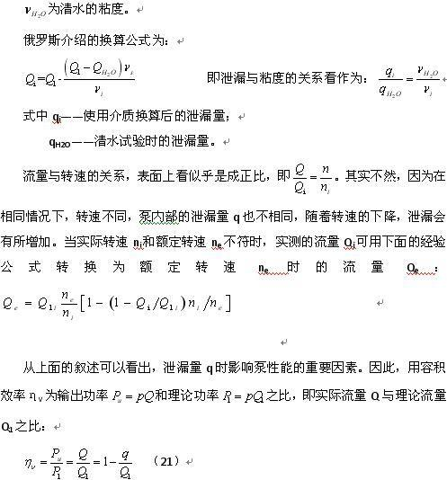 顯而易見,同一臺離心水泵在運輸不一樣黏度的液態時,即便在同樣的吸入工作壓力、清除工作壓力和同樣的轉速比下,其泄露量也是不一樣的。在我國現行標準的標準流量Q是以凈化水做為規范的 實驗物質。因為同一商品能夠運輸不一樣黏度的液態,而一般生產制造商品的公司是不太可能都按商品具體應用的物質開展實驗,因此在我國螺桿泵制造業企業的實驗臺基本上全是以冷水做為實驗液態,再按商品具體運輸的液態黏度開展計算,因此螺桿泵的具體流量是以水為規范的。公式換算選用的是經驗公式定律,與具體情況會出現差值,并且即便是同一個公式換算對不一樣的物質黏度換 算的差值尺寸都不同樣。它是因為這種經驗公式定律的根據是實驗,而實驗量的是多少、收集實驗數據信息的恰當水平、實驗用的螺桿泵的不一樣和實驗工作狀況的差別等狀況的不 同,都是會得到不一樣的經驗公式定律,計算后與具體的差值當然也不太可能同樣。
