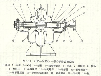 該型雙吸消防泵的關鍵零件有:雙吸消防泵泵殼1、雙吸消防泵泵蓋2、雙吸消防泵葉輪3、雙吸消防泵泵軸4、雙吸消防泵雙吸密封環5、雙吸消防泵軸套6、雙吸消防泵滾動軸承15等構成(圖3-13)。除軸的原材料為合金鋼,密封環為銅鑄外,其他多見生鐵做成。