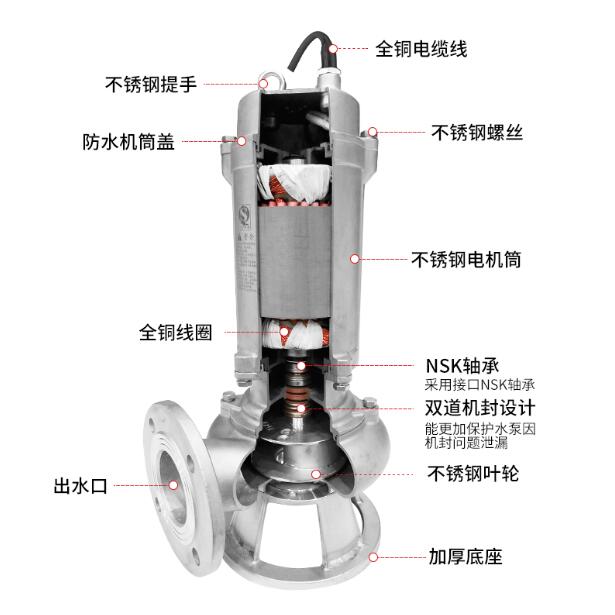 不銹鋼潛水污水泵該系列產品不銹鋼潛水污水泵整個機械采用不銹鋼材料,達到物質具備腐蝕的場所,無堵塞、全自動藕合安裝、配備電機監控系統、具備滲水維護作用。